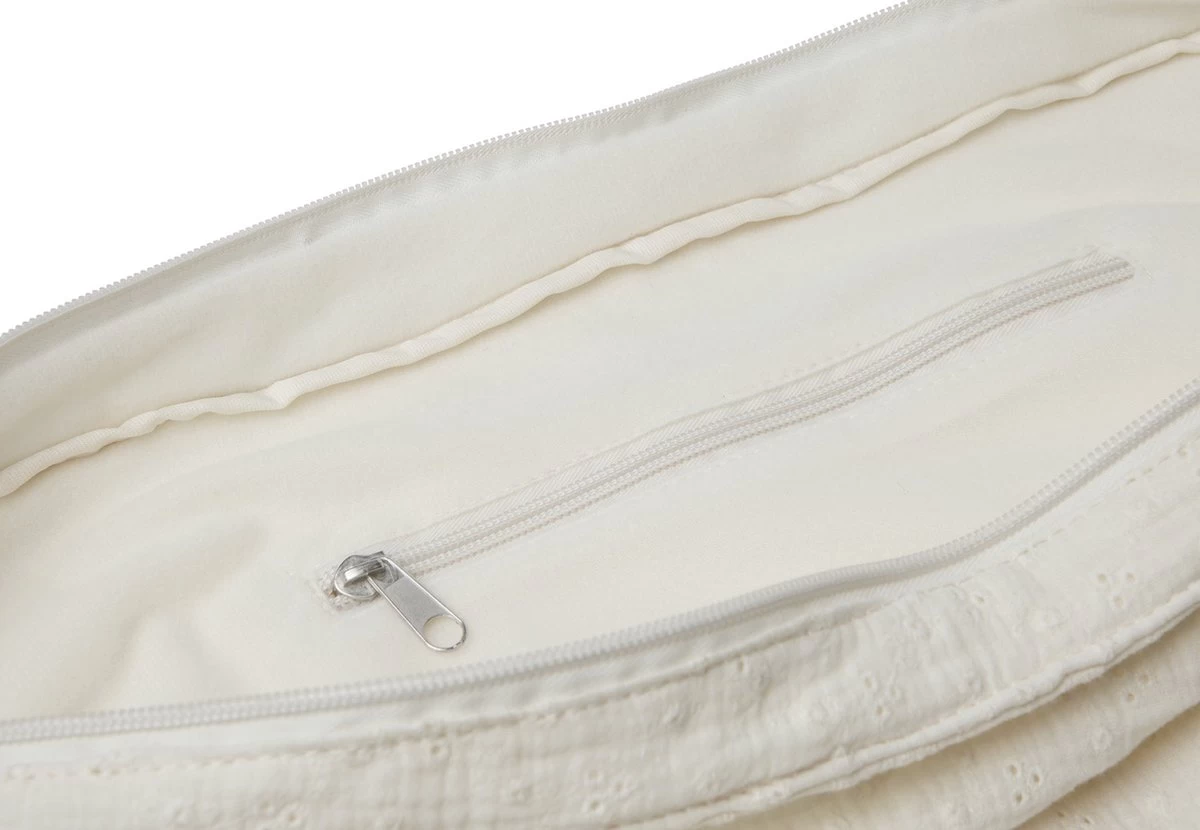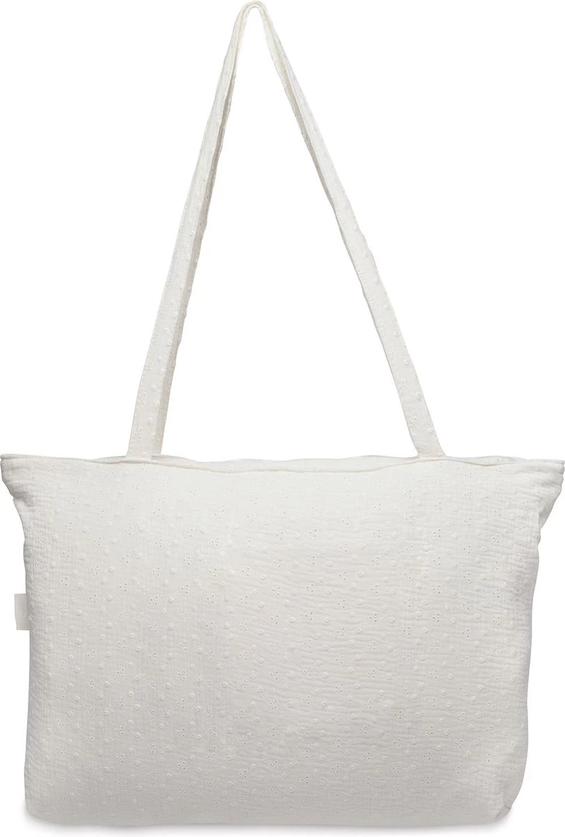 De tas is gemaakt van een zachte muslin stof in een heerlijk kleurtje, biscuit. De buitenkant van de tas heeft een lief embroidery werkje van bloemetjes in de stof en de binnenkant is gemaakt van polyester.