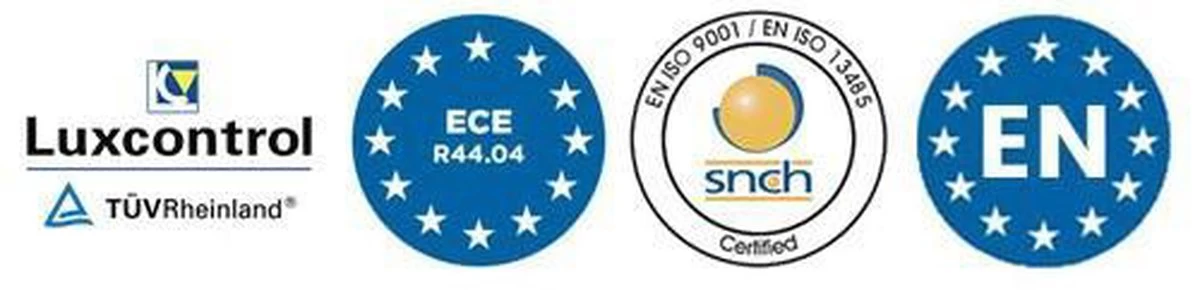 De hoge kwaliteit, betrouwbaarheid en veiligheid van Luuk wordt bevestigd door de toegekende Lux Control en SNCH certificaten. Het product voldoet aan de ECE R44.04 norm.