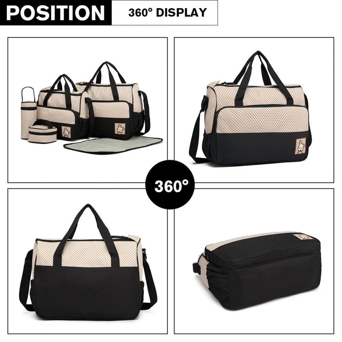 Deze complete Miss Lulu luiertas set is ideaal voor onderweg. Een compacte en functionele set met een 2 verschillende formaten luiertassen inclusief verschoonmatje voor je baby en een tasje voor de fles en het eten. Deze complete, betaalbare luiertas set mag niet ontbreken in je baby uitzet! Met 5 verschillende tassen is de verzorgingstas gemakkelijk te organiseren, super handig in gebruik en biedt werkelijk een zee van ruimte. Denk aan luiers, flesjes, babyvoeding, speentjes, slabbetjes en rompertjes, voor werkelijk alles is een plekje. De 5-delige set is gemaakt van hoogwaardig waterafstotend polyester, heeft een stijlvol design en gaat de gehele luiertijd mee! Of je nou boodschappen gaat doen, op een speelafspraakje gaat of een dagje weg; deze veelzijdige tas komt altijd van pas!